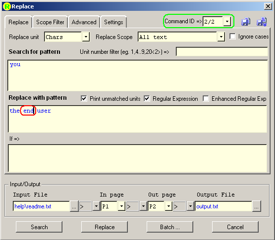2. A replace dialog will popup, the Command ID in top right corner will show how many commands are selected.