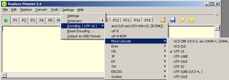 Replace Pioneer support most types of encodings, including most popular UTF-8 and UTF-16.