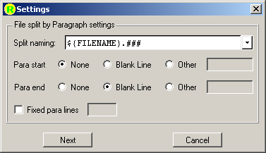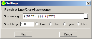 < Save to files -- Split by bytes/chars/lines/files--> Will split current page to number of bytes/chars/lines/files. The number and bytes/chars/lines/files switches can be set at Settings->Settings menu.