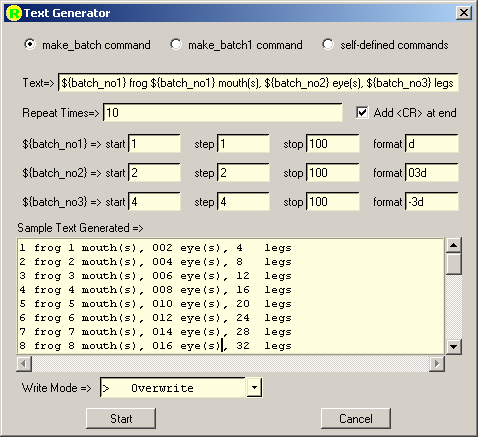 By changing "Text=>" entry, Repeat Times, and ${batch_no*} rules, user can get lines of text with desired format and sequence no.