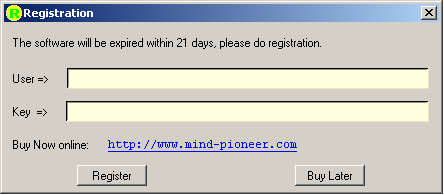 4. Register => after purchase, user will get a UserName and Key, enter them and click OK, the formal license will be activated. The unregistered version will be expired within 21 days, see Registration for detail.