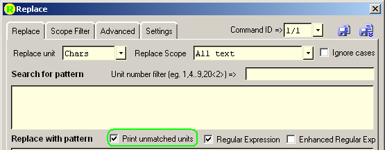 If "Print unmatched units" is checked, all the text not matching the pattern will be copied to the output, this is the default setting.